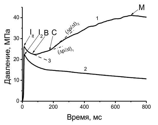 Исследуемые составы начинали гореть в послойном режиме, если давление воспламенителя равнялось или превышало некоторое пороговое значение Pit. После его достижения (точка Iit с координатами Pit, tit, кривая 1 рис. 2) давление сначала снижалось из-за охлаждения продуктов сгорания воспламенителя стенками манометрической бомбы и металлического стаканчика, а также их фильтрации в поры образца. Возникновение горения смеси приводило к изменению зависимости p(t) от спадающей на возрастающую. Для определения значений давления Pb и времени tb, при которых начиналось послойное горение, проводилась экстраполяция кривой снижения давления воспламенителя (штриховая кривая 3) до момента изменения темпа нарастания давления на кривой 1 (точка С). За возникновение ПГ принимался момент, соответствующий точке B с координатами Pb, tb, после которого происходило отклонение реальной кривой от экстраполированной. Такое отклонение свидетельствует об увеличении давления за счет дополнительного поступления газов и тепла от горения смеси. После возникновения послойного горения давление в бомбе еще некоторое время снижалось до достижения локального минимума. Дальнейшее развитие ПГ происходило в условиях нарастающего давления с разными интенсивностями его подъема (∆p/∆t). При анализе записей p(t) измерялось среднее значение скорости его роста на начальной, (∆p/∆t)1, и последующей стадиях, (∆p/∆t)2. Согласно проведенным ранее исследованиям [3, 4], принималось, что повышение ∆p/∆t связано с переходом послойного горения в конвективное. Определялись значения давления Pс и времени tс (точка С), при которых начиналось заметное (в 3 и более раза) увеличение интенсивности роста давления. По значениям времен начала послойного (tb) и конвективного (tс) горения рассчитывалась длительность протекания послойного горения (от точки B до точки C) как разница между ними: td = tс − tb.
