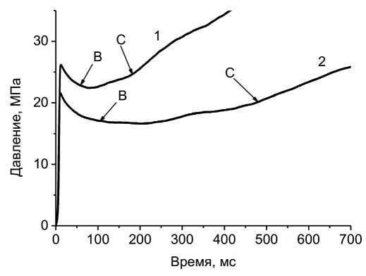 Рис. 5. Изменение зависимости давления от времени при сгорании смесей 18 вес.% АСД-4 + 82 вес.% АС (кривая 1, опыт № 661) и 18 вес.% ПАП-2 + 82 вес.% АС (кривая 2, опыт № 711).