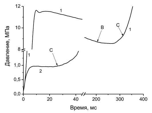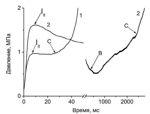 При давлении воспламенителя ниже порогового (точка I2, кривая 2 рис. 2) послойного и конвективного горения не возникало. Давление только снижалось из-за охлаждения продуктов сгорания. Смесь уплотнялась и частично разлагалась.