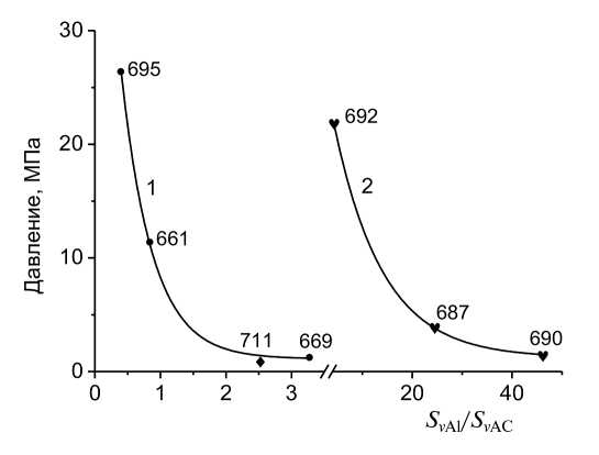 Рис. 7. Изменение порогового давления воспламенителя от отношения площади поверхности частиц алюминия к площади поверхности гранул аммиачной селитры в единице объема смеси (Sv Al/Sv AC) для образцов с dAC = 20–40 мкм (кривая 1) и 250–630 мкм (кривая 2).