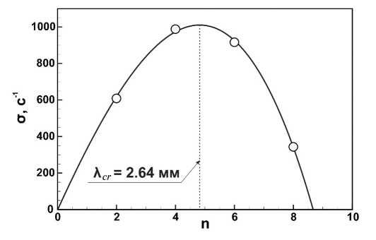 На рис. 2 приведена дисперсионная кривая зависимости σn от n для смеси 15% водорода с воздухом, из вида которой можно заметить, что инкремент σn достигает максимума при n ≈ 3.78, что соответствует критической длине волны наиболее быстро растущей моды λcr = 2.64 мм. Таким образом, на начальной стадии развития неустойчивости фронта пламени, наблюдается наиболее быстрый экспоненциальный рост гармоник с длиной волны, равной критической. Дальнейшая эволюция фронта горения определяется нелинейным взаимодействием между гармониками и последующей нелинейной стабилизацией фронта [16]. На стадии нелинейной стабилизации доминируют длинноволновые гармоники, и фронт пламени приобретает вытянутую одномодовую структуру, на боковой поверхности которой развивается вторичная неустойчивость. Данная конфигурация характеризуется наибольшей площадью поверхности фронта горения и, соответственно, максимальной скоростью распространения пламени в невозмущенной среде.