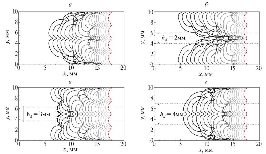 Рис. 3. Динамика развития структуры фронта пламени в чистой газовой смеси 15% водорода с воздухом и в присутствии микрокапель воды: а – горение без капель воды; б – горение с подачей капель воды в зону горения при hd = 2 мм, 3 мм (в) и 4 мм (г). Сплошные черные линии – изолинии температуры T = 1000 К, штриховые красные линии – начальное возмущение, штрихпунктирные черные линии – траектории микрокапель. Время между отдельными изолиниями Δt = 1 мс.