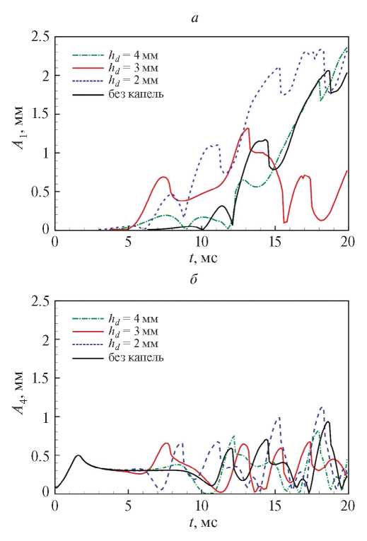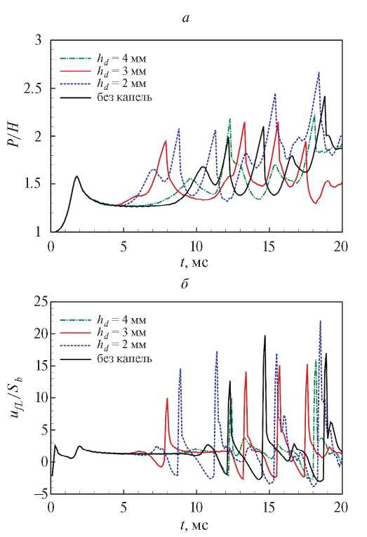 На рис. 4 представлены временны́е зависимости амплитуды гармоники с длиной волны, равной ширине канала (n = 1), рис. 4а, и начальной гармоники (n = 4), рис. 4б. Из рисунка видно, что в чистой газовой смеси после начальной стадии развития неустойчивости, пространственная структура фронта пламени определяется длинноволновой гармоникой с длиной волны, равной ширине канала. В зависимости от характерного пространственного масштаба, определяющего влияние микрокапель воды на фронт горения, может наблюдаться как ускорение перехода к одномодовой структуре (в случае hd = 4 мм), так и его отсутствие (hd = 3 мм). В случае, когда наличие микрокапель воды в горючей газовой смеси препятствует нелинейной стабилизации неустойчивости, эволюция фронта пламени определяется непрерывной генерацией быстрорастущих гармоник. При этом пространственная структура пламени близка к плоской (см. рис. 3в) и, как можно видеть из рис. 5а, существенного увеличения площади поверхности пламени не наблюдается. Временна́я зависимость скорости изменения средней координаты фронта ⟨x⟩f, нормированная на нормальную скорость горения Sb, представлена на рис. 5б. Резкие изменения средней скорости со временем связаны с моментами изменения пространственной конфигурации фронта и соответствующего изменения площади поверхности пламени. Как следует из графиков, представленных на рис. 5, воздействие микрокапель воды на фронт пламени с характерным пространственным масштабом, близким к критической длине волны, ограничивает величину площади поверхности пламени и тем самым препятствует ускорению пламени за счет растяжения в ходе развития стадии нелинейной стабилизации неустойчивости.