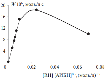 где RH – субстрат окисления, а – параметр, характеризующий окисляемость RH и равный отношению констант скоростей продолжения (kp) и обрыва (kt) цепи, а = kp /(2kt)0.5. Скорость инициирования равна Wi = ek0[АИБН], где e – выход радикалов из клетки, k0 – константа скорости распада инициатора.