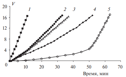 Рис. 3. Кинетические кривые поглощения кислорода (V– объем поглощенного кислорода в отн. ед.) при окислении соевого лецитина в отсутствие (1) и в присутствии 7·10-4 моль/л антиоксидантов: 2 – ТТБФ, 3 – Q, 4 – ДТБХ, 5 – ТФ; [АИБН]0 = 0.03 моль/л, [RH]0 = 0.4 моль/л; температура – 333 К.