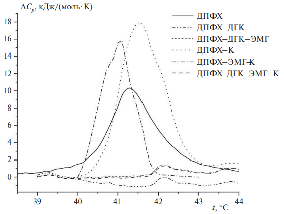 Измерение термодинамических параметров и функций фазового перехода в бислое липосом проводили на модельном дипальмитоилфосфатидилхолине с использованием метода ДСК на микрокалориметре ДАСМ-4M (Пущино, Россия). Измерения проводили при постоянном давлении в 2.5 атм в температурном диапазоне от 20 до 50 °С. Скорость нагрева соответствовала 0.5 °C/мин для всех измерений. Концентрация в образцах составляла (1.0·10–3 г/мл) ДПФХ. Чувствительность калориметрического измерения составляла не менее 5 · 10-6 Дж/с. Результаты, представленные в данной работе, являются средним значением, как минимум, трех независимых измерений.
