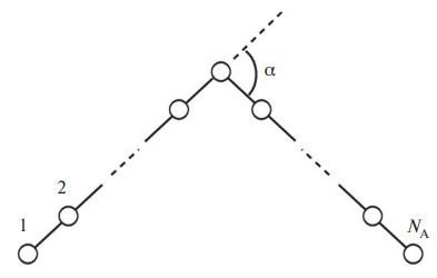Рис. 1. Модель V-образной молекулы, образованной двумя жесткими сегментами, соединенными под внешним углом α. Молекула состоит из мономерных звеньев (обозначены как 1, 2… NA), общее число которых равно NA.