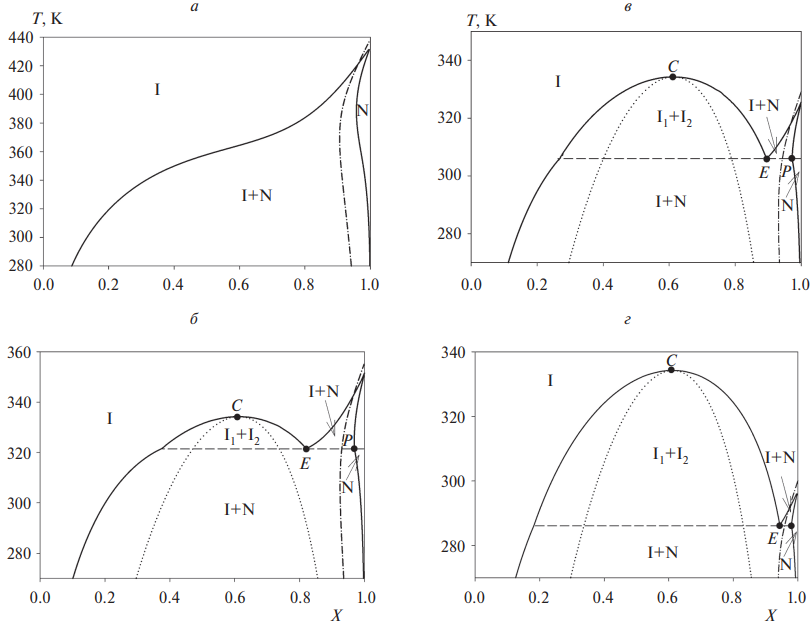 Помимо бинодалей, определяемых в результате минимизации свободной энергии двухфазной системы (14), интерес представляет и положение спинодалей I1 + I2 и I + N. Спинодаль фазового разделения типа жидкость–жидкость (I1 + I2) определяет границу абсолютной неустойчивости однофазного раствора по отношению к образованию двухфазной системы и определяется известным соотношением [35]: