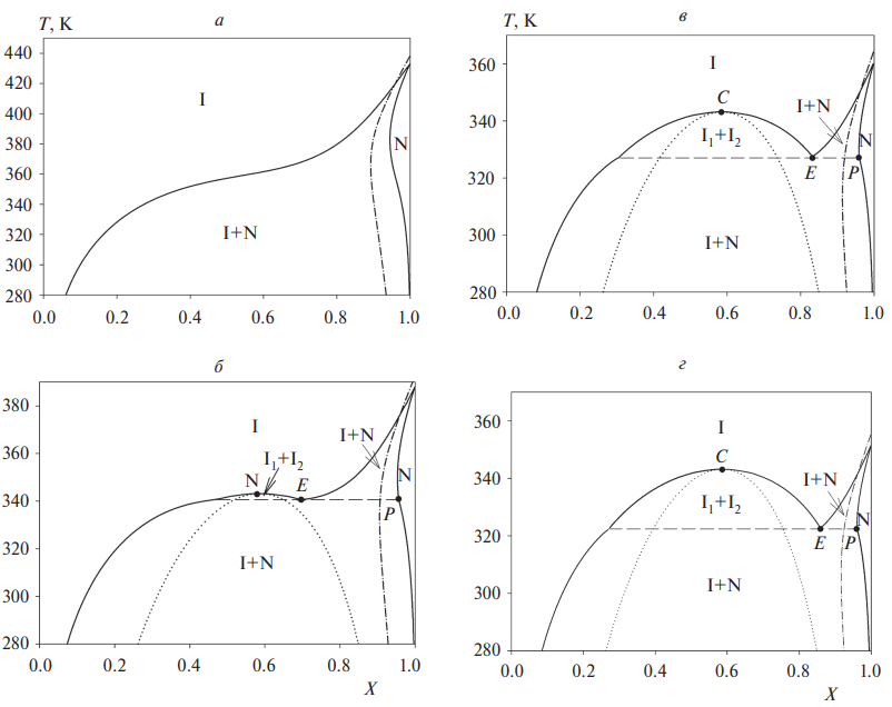 Рис. 2. Фазовые диаграммы смеси полимер/V-образный ЖК при φ = 1/2 и различных внешних углах между сегментами ЖК: a – a = 0, б – a = 0.524 рад, в – a = 0.611 рад, г – a = 0.6106. Бинодали показаны сплошными линиями, спинодаль жидкость–жидкость – точечной линией, спинодаль жидкость – нематическая фаза – штрих-пунктирной линией. Буквы C, E и P обозначают соответственно критическую точку, точку эвтектики и точку, отвечающую наименьшему значению X состава смеси, при котором реализуется однофазное нематическое состояние N.