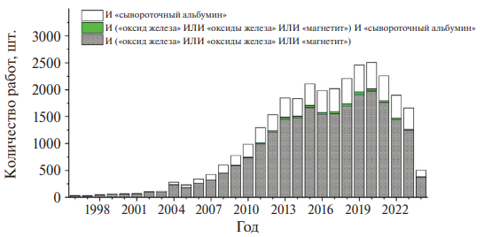 На рис. 1 представлено изменение числа публикаций по годам в базе PubMed с 1996 года по наночастицам оксидов железа, являющихся объектом нашего интереса, и/или сывороточному альбумину. Как видно из этого рисунка, несмотря на значительное количество исследований в области интересующих нас наночастиц (рис. 1, заштрихованные столбцы) и исследований, посвященных одновременно наночастицам и сывороточному альбумину (рис. 1, белые столбцы), количество работ, посвященных одновременно использованию наночастиц оксидов железа и сывороточного альбумина, относительно невелико. Стоит отметить, что такие исследования могут быть посвящены не только синтезу гибридных наносистем на основе МНЧ и альбумина, но и исследованию формирования белковой короны на наноразмерных материалах, в состав которой входит сывороточный альбумин как наиболее представленный белок плазмы крови [17–19].