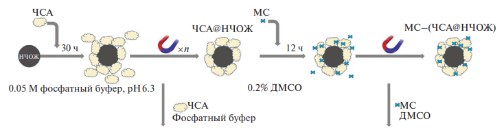 Магнитные НЧОЖ были синтезированы методом соосаждения и электростатически стабилизированы 0.1 М фосфатно-цитратным буфером (0.05 М NaCl) с pH 4.3, как описано в предыдущих исследованиях [12, 43]. Гидрозоль НЧОЖ хранили в герметично закрытой посуде. Для приготовления образцов гидрозоль НЧОЖ разбавляли в 20 раз в 0.05 М фосфатном буфере с pH 6.3 и инкубировали на магнитах Nd–Fe–B для удаления наиболее крупных частиц, после чего к НЧОЖ с концентрацией 0.4 мг/мл в буфере при перемешивании на приборе Vortex V-1 plus производства компании Biosan (Latvia) добавляли водный раствор ЧСА (каталожный номер А1653, Sigma-Aldrich(USA)) в количестве 10 об.% до конечной концентрации 3 мг/мл и инкубировали смесь в течение 30 ч при температуре 25 °С на ротаторе Multi Bio RS-24 (Biosan, Latvia). После инкубации для отделения буфера и несвязавшегося с НЧОЖ белка использовали процедуру магнитной сепарации. Вода для инъекций с 5 мМ NaCl была использована в качестве дисперсионной среды для наночастиц ЧСА@НЧОЖ (рис. 2). Удаление избытка белка подтверждали и количество белка на поверхности НЧОЖ оценивали с применением метода Бредфорда, как было описано ранее [6]. Спектры в УФ- и видимой области регистрировали на планшетном спектрофотометре SPECTROstar Nano производства компании BMG (Germany) в 96-луночном планшете фирмы Greiner. Устойчивость покрытия из ЧСА на НЧОЖ подтверждали в соответствии с методикой, описанной ранее [6, 48, 49], с применением раствора иммуноглобулина G производства НПО “Микроген” (Россия). Данные о размере частиц в образцах на различных стадиях приготовления определяли с использованием динамического светорассеяния на оборудовании Zetasizer Nano-ZS производства компании Malvern (Great Britain) при температуре 25 °C. Метод электронного магнитного резонанса (ЭМР) был использован для оценки концентрации НЧОЖ в различных образцах в сравнении с эталоном с известной концентрацией МНЧ. Cигналы ЭМР образцов регистрировали на спектрометре EMX-8/2.7 X-диапазона производства компании Bruker (Germany). Математическую обработку спектров ЭМР проводили с применением программного обеспечения WINEPR и SimFonia фирмы Bruker (Germany).