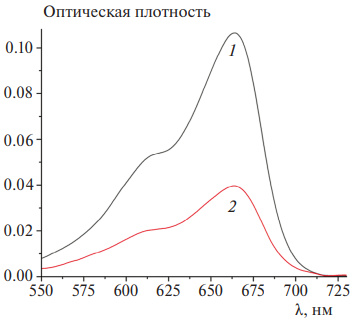 Рис. 3. Спектры поглощения метиленового синего в воде (1) и в надосадочном растворе после магнитной сепарации МС–(ЧСА@НЧОЖ) (2).