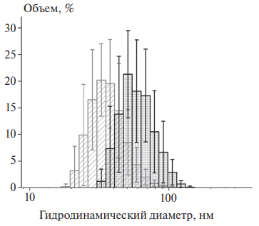 Средние гидродинамические диаметры частиц, вносящих максимальный вклад в численные распределения частиц по размеру составляют ~ (33 ± 2) нм для НЧОЖ без покрытия и ~ (52 ± 5) нм для ЧСА@НЧОЖ. Толщина белкового покрытия на НЧОЖ, рассчитанная по средним гидродинамическим диаметрам частиц (при условии, что покрытие формируется на НЧОЖ, не вызывая их дополнительной агрегации), составляет ~10 нм (рис. 4).