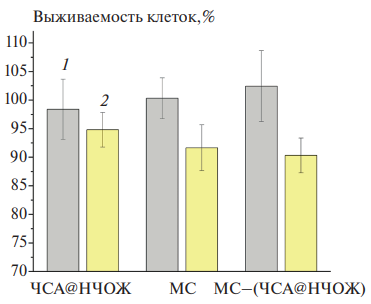 Рис. 5. Темновая (1) и фотоиндуцированная цитотоксичность (2) ЧСА@НЧОЖ, МС–(ЧСА@НЧОЖ) и МС на клетках MCF-7.