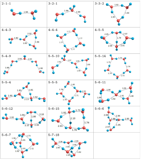 У каждой молекулы воды в кластере есть возможность образовывать от одной до четырех водородных связей; при этом для двух связей она может выступать донором протона, а для других двух – акцептором. Различные варианты расположения водородных связей обуславливают значительное структурное многообразие кластеров. Для кластера, состоящего из n молекул воды, возможны два типа изомерии: