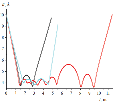 Напомним, что обычным бинарным столкновением называется такое столкновение, при котором имеется единственное расстояние наибольшего сближения частиц (всего один минимум в зависимости межчастичного расстояния от времени R(t)). Столкновительные комплексы имеют два и более минимумов в R(t) (более подробно см. работы [10, 17]). На рис. 3 приведены примеры траекторий с образованием столкновительного комплекса в системе Ar–CH4.