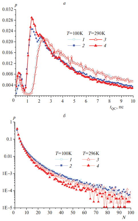 Из рис. 4а видно, что распределения времен жизни QC tQC очень чувствительны к виду ППЭ (ср. кривые 1, 2 и 3, 4) и слабо зависят от температуры (ср. кривые 1, 3 и 2, 4). Что касается распределения числа точек поворота N (рис. 4б), то влияние вида ППЭ практически отсутствует, однако более выражена зависимость от температуры (большее число N характерно для T = 100 K).