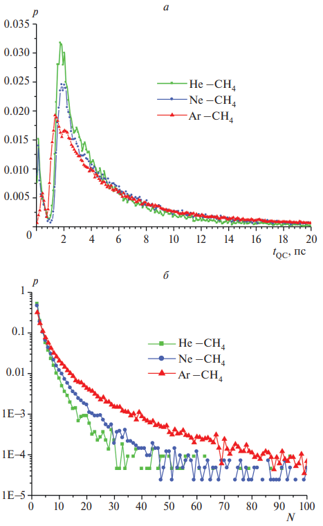 На рис. 5 показаны распределения времен жизни метастабильных димеров СН4 – He, Ne, Ar и точек поворота. Диапазон времен жизни QC довольно широк – от долей пикосекунды до десятков пикосекунд. При этом наиболее вероятное время жизни комплексов составляет tQC ~ 1–2 пс. Наиболее вероятным значением числа точек поворота в QC для всех пар является N = 2. Большое число точек поворота (N > 10) характерно для СН4 – Аr. Комплексы СН4–He, Ne “склонны” иметь меньшее число N.