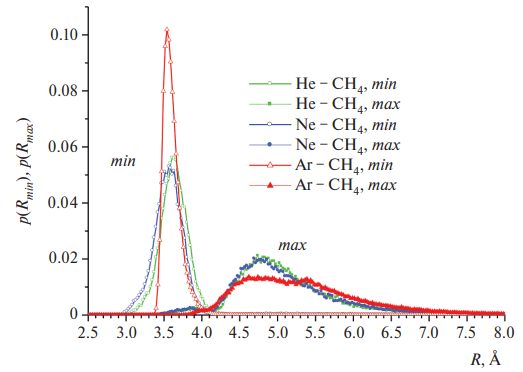 Обратим внимание еще на одно обстоятельство. По оценкам работы [47], полученным из коэффициента вязкости газа, состоящего из молекул – жестких сфер, номинальные диаметры CH4, He, Ne, Ar составляют: dCH4 = 4.19 Å, dHe = 2.19 Å, dNe = 2.60, dAr = 3.66 Å. При этом “размер” такого идеализированного столкновения составляет и равен 3.19, 3.4, 3.93 Å, соответственно. Сравнивая эти значения с результатами расчетов минимального и максимального размеров QC, приведенными на рис. 6, можно видеть, что указанные значения примерно соответствуют лишь Rmin, в то время как предельные размеры комплексов Rmax в рассмотренных случаях превышают их, более, чем в 1.5 раза. Данное обстоятельство следует учитывать при моделировании межмолекулярных взаимодействий метана.