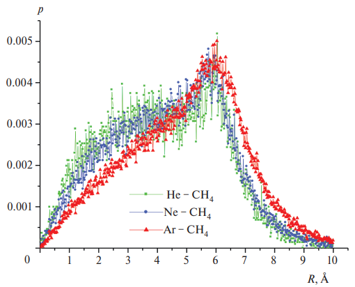 Результаты, представленные на рис. 5–9, соответствуют Т = 100 К. При этом значения KQ обработанных в статистическом анализе комплексов составил: для He–CH4 – KQ=22200, для Ne–CH4 – KQ=42000, для Ar–CH4 – KQ=115600.