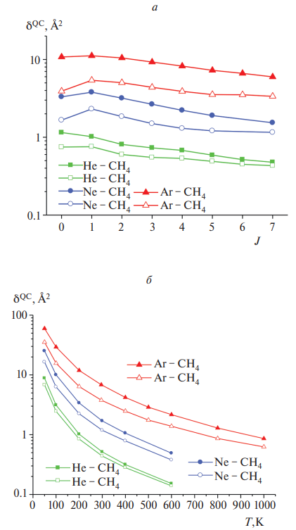 Из данных рис. 8 можно сделать следующие выводы. Сечение образования QC в столкновениях для всех трех пар слабо зависит от J: наибольшее значение sQC имеет место для Ar–CH4 , а наименьшее для – He–CH4. При этом упругие столкновения дают заметный вклад в сечение образования QC, особенно для He–CH4. Неупругие столкновения увеличивают значения sQC, особенно при малых J для Ar–CH4 и Ne–CH4. С ростом величины J влияние неупругих соударений уменьшается, поскольку из-за вращения молекулы CH4 роль анизотропии потенциала снижается. Из рис. 8б видно, что эффективность образования QC быстро растет с понижением температуры.