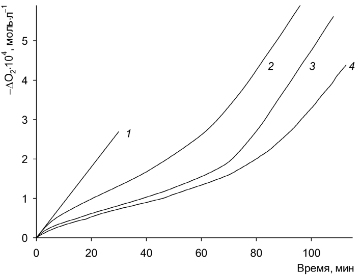 Рис. 2. Кинетические кривые поглощения кислорода при окислении LH в мицеллах без ингибитора (1) и в присутствии 4 · 10–6 моль · л–1 ДОФА (2), дофамина (3) и норадреналина (4); [СОД] = 100 ед./мл, pH = 7.4.