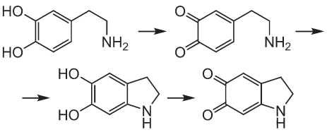 Данный процесс может протекать не только ферментативным, но и радикальным путем [12–14]. На второй стадии представленной упрощенной схемы образуется производное пирокатехина гетероциклической природы (5,6-дигидроксииндол), которое само по себе должно обладать антиоксидантными свойствами. Причем наличие донорной аминогруппы в бензольном кольце может обуславливать более высокую силу антиоксидантного действия по сравнению с исходным катехоламином. Отметим, что значения f для катехоламинов при окислении этилбензола не превышают двух [15], т.е. такая циклизация в органической среде не происходит.