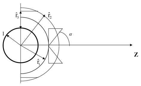 Рис. 2. Полусферический концентрический слой H0: 1 ≤ ^r ≤ ^r2, p/2 ≤ q ≤ 0, 2p ≤ j ≤ 0; полусферический концентрический слой H1: 1 ≤ ^r ≤ ^r1, p/2 ≤ q ≤ 0, 2p ≤ j ≤ 0; полусферический концентрический слой H2: ^r1 ≤ ^r ≤ ^r2, p/2 ≤ q ≤ 0, 2p ≤ j ≤ 0; cos a = 0.886.
