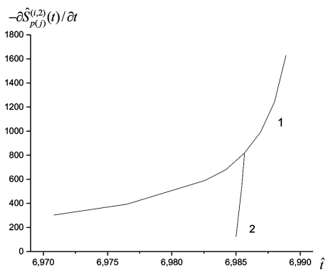 Пусть изображающая точка перемещается вверх по кривой (рис. 1). К моменту времени t = t1 зона закручивания достигает степени возбуждения, характеризуемой функцией Sp(0(0),2)(t = t1). Моменту времени t = t1 соответствует точка пересечения кривых 1 и 2 на рис. 2. В момент t = t1 справедливы соотношения