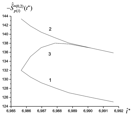 Поведение во времени парной энтропии рассчитывается в пределах слоя H1 с перемещающейся в пространстве внешней границей ^r1(t). В момент t1 парная энтропия ^Sp(0(1),2)(t = t1) обладает предельно низким значением, т.е. Начиная с момента времени t = t1 движение системы описывается обратными уравнениями многомоментной гидродинамики. Пусть начала отсчета времени на двух временных осях совпадают. Кривой 1 на рис. 4 представлена эволюция парной энтропии : . Кривой 2 представлена эволюцию парной энтропии : . Кривой 3 представлена эволюция парной энтропии с перемещающейся внешней границей : . Отрезок времени выбран так, чтобы при достижении момента времени t* = t1 + T величина парной энтропии достигла величины, которой парная энтропия обладает в момент t = t1: