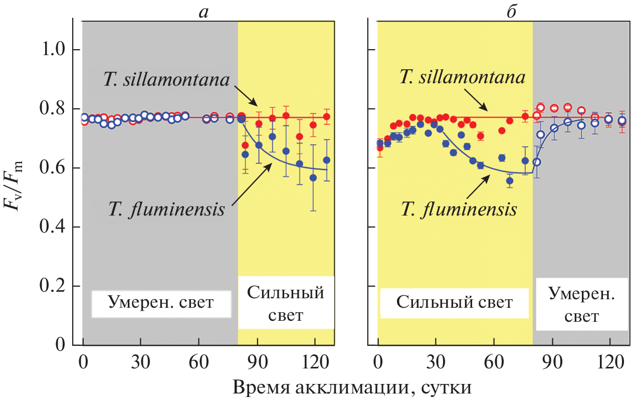In this work we investigated the electron transport processes in chloroplasts of two contrasting species of Tradescantia, the shade-tolerant species T. fluminenesis and the light-loving species T. sillamontana, grown under moderate or strong light conditions. Plants were acclimated to a moderate or high intensity of photosynthetically active radiation. Photochemical activity of Photosystem 2 (PS2) was assayed by measuring chlorophyll a (Chl a) fluorescence, using the OJIP test, and by monitoring a slow induction of Chl a fluorescence (SIF) in Tradescantia leaves in vivo and in situ. The coefficient of non-photochemical quenching (NPQ) of Chl a fluorescence was determined from the SIF kinetics. Photochemical activity of photosystem 1 (PS1) was determined by electron paramagnetic resonance from the light-induced redox transients of P700, photoreaction center of PS1. Shade-tolerant (T. fluminenesis) and light-loving (T. sillamontana) species showed clear differences in their photosynthetic characteristics depending on long-term (up to 5 months) acclimatization to moderate (50–125 µmol photons m–2 s–1) or strong (850–1000 µmol photons m–2 s–1) irradiation with photosynthetically active white light. In the leaves of light-loving species T. sillamontana, the photosynthetic characteristics changed only slightly upon variations of light intensity. Leaves of the shade-tolerant species T. fluminenesis exhibited a pronounced sensitivity to changes in light intensity during acclimatization, showing a reversible increase in NPQ accompanied by an attenuation of PS2 photochemistry. After the reduction of light intensity, photochemical activity of PS2 recovered.