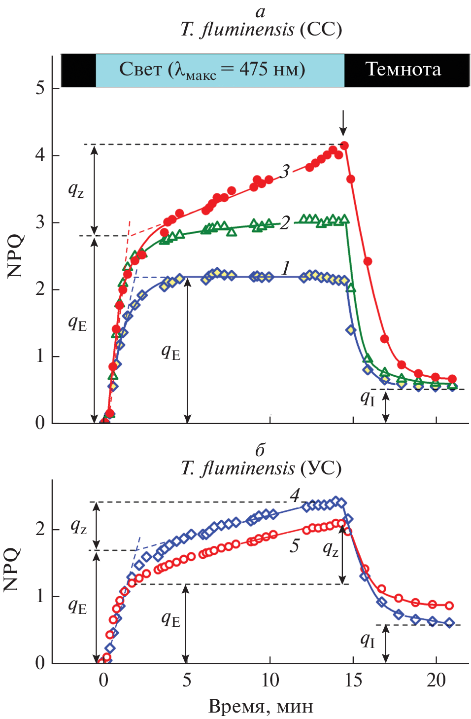 - Ptushenko V.V., Zhigalova T.V., Avercheva O.V., Tikhonov A.N. 2019. Three phases of energy-dependent induction of and Chl a fluorescence in Tradescantia fluminensis leaves. Photosynth. Res. 139, 509–522.