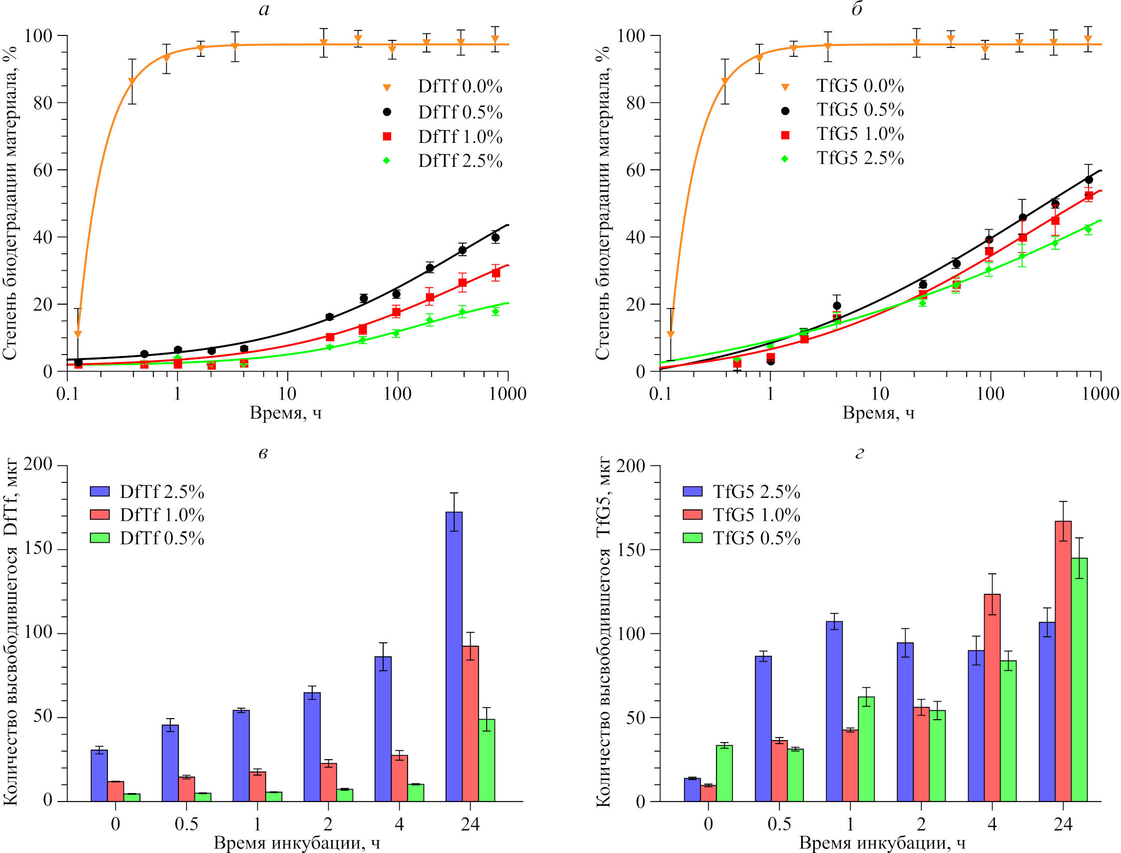 Было показано, что доля аминогрупп, участвующих в формировании поперечных сшивок, дозозависимо возрастает с увеличением количества полифенола, введенного в состав материала. Так, доля аминогрупп, участвующих в формировании сшивки, составляет 73±7, 80±3 и 90±5% при доле DfTf в материале 0.5, 1.0 и 2.5% соответственно. Доля аминогрупп, участвующих в формировании сшивки, составляет 69±3, 73±5 и 78±4% при доле TfG5 в материале 0.5, 1.0 и 2.5% соответственно. Было установлено, что доля фрагментов полипептида, высвобождающихся в процессе деградации материалов, уменьшается с увеличением доли полифенола в материале (рис. 2а, 2б). Полной деградации материалов на протяжении всего эксперимента не наблюдалось. Было обнаружено, что в процессе деградации материала в окружающую среду высвобождается (биологически активный) полифенол (рис. 2в, 2г).