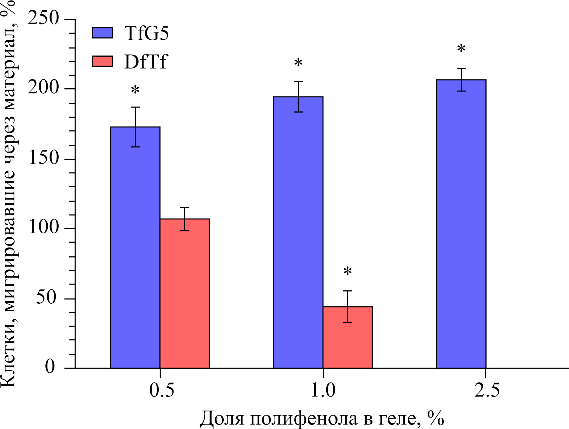 Миграция фибробластов через материалы, полученные на основе коллагена и производных таксифолина (DfTf и TfG5). Было обнаружено, что TfG5 способствует миграции клеток через материал. Увеличение доли TfG5 в материале приводит к увеличению числа клеток, мигрировавших через материал (рис. 3). DfTf при его доле в материале 0.5% не влияет на миграцию клеток, тогда как увеличение доли данного полифенола в материале до 1.0% приводит к снижению миграции клеток в среднем на 55%. При доле DfTf в материале 2.5% клеток, мигрировавших через материал, обнаружено не было. За 100% принимали количество клеток, мигрировавших через нативный коллаген.