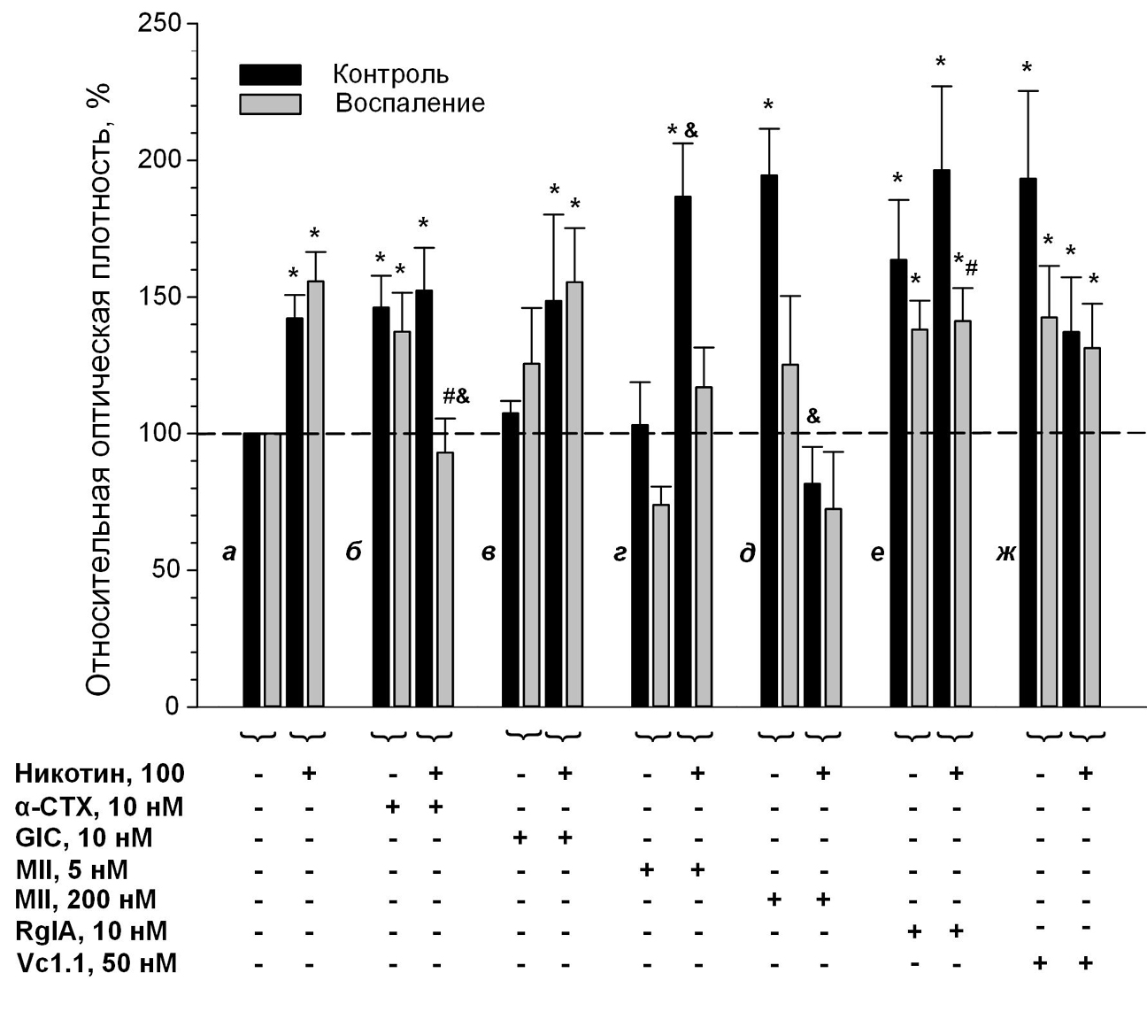 Рис. 1. Влияние лигандов нАХР на адгезию КМ-гранулоцитов контрольных животных и животных с воспалением. Показано действие 100 мкМ никотина (а) или одного из антагонистов и антагониста совместно с никотином на адгезию интактных клеток: 10 нМ α-CTX (б), 10 нМ GIC (в), 5 нМ MII (г), 200 нМ MII (д), 10 нМ RgIA (е) или 50 нМ Vc1.1 (ж). Одиночное действие токсинов на адгезию КМ-гранулоцитов контрольных мышей и животных с воспалением представлено двумя столбцами слева соответственно, действие никотина (100 мкМ) в присутствии одного из антагонистов – двумя столбцами справа в каждой группе диаграмм (бж); для сравнения показано действие никотина на интактные клетки (а). Присутствие или отсутствие вещества обозначены “+” или “–“ соответственно. * – Значимое отличие от параметра, принятого за 100%; # – отличие эффекта агента в контрольной и “воспалительной” группах; & – различие между действием антагониста и совместно антагонист + никотин на интактные клетки, p < 0.05.