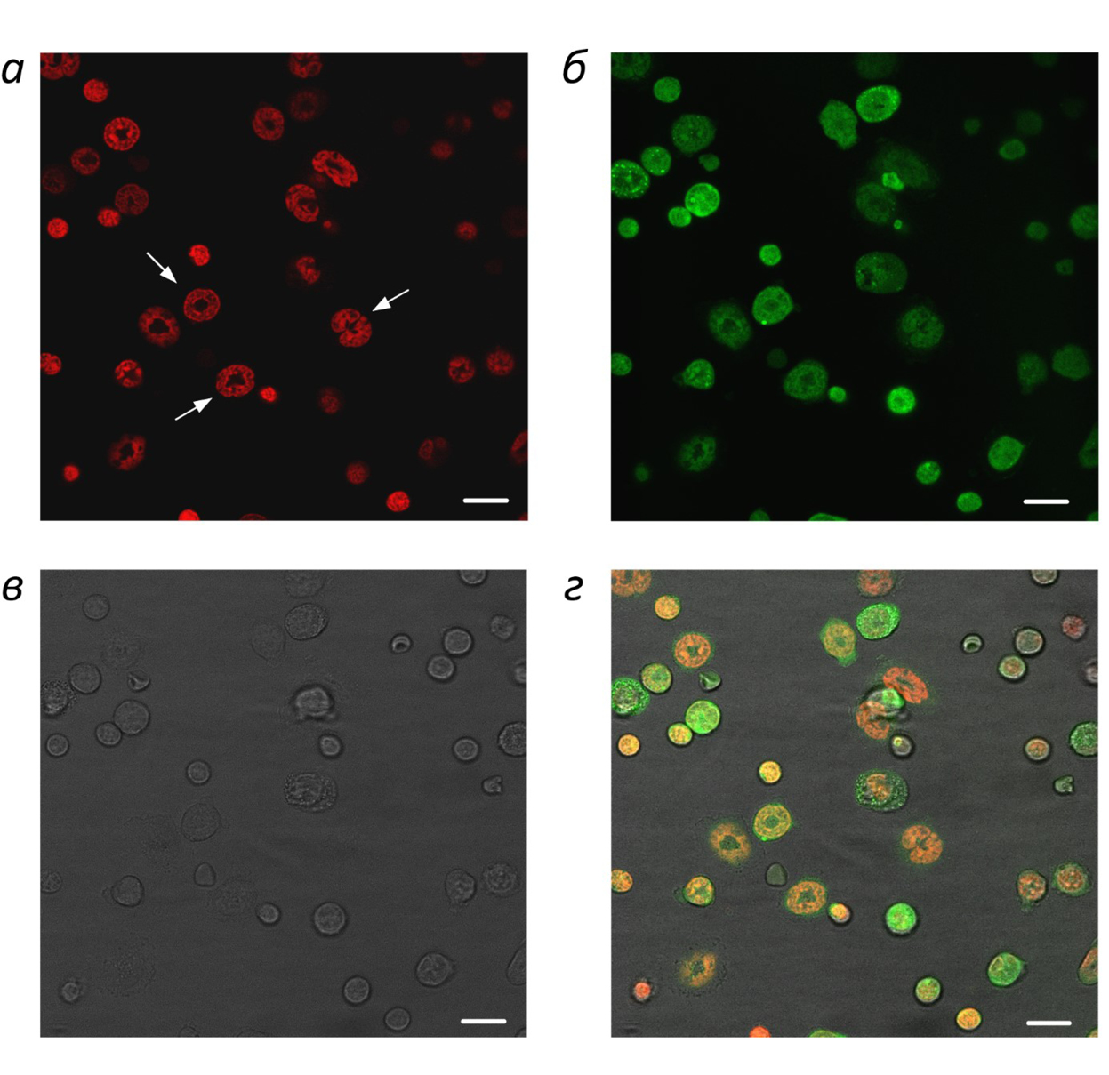 4. Fig. 3. Visualization of α10 nAChR subunit on CM-granulocytes. Microphotographs of cells after treatment with primary anti-α10 nAChR and secondary AF488-anti-IgG antibodies: a, b - NucRed and AF488-α-CTX fluorescent signals, respectively; c - visible light image; d - overlay of images. Examples of granulocytes are shown with arrows. Scale bar: 10 μm.
