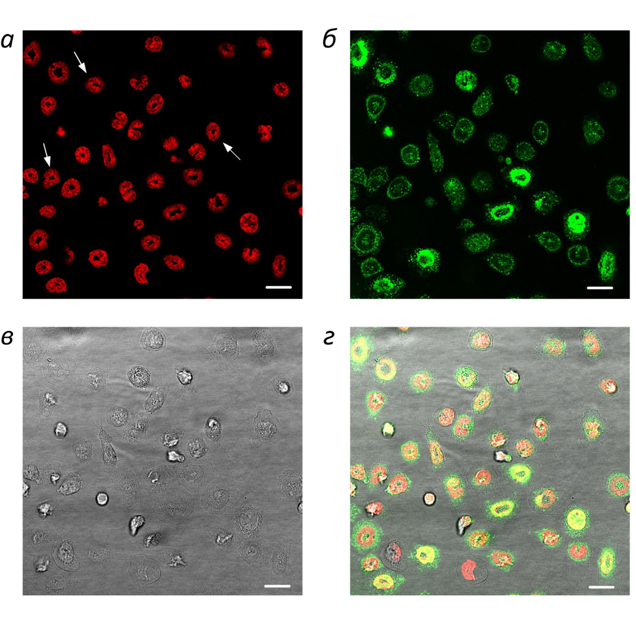 Флуоресцентное окрашивание α10 нАХР. Иммуноцитохимическое окрашивание клеток с помощью меченых антител к субъединице α10 нАХР проводили по протоколу [39]. Клетки фиксировали 4% формальдегидом в PBS (15 мин), трижды промывали PBS, инкубировали с 1% БСА в PBS для блокирования дальнейшего неспецифического связывания антител (30 мин). Затем инкубировали в течение 1 ч с первичным поликлональным антителом (анти-α10 нАХР) кролика против α10 нАХР (Abcam, Великобритания) в разведении 1:100, трижды промывали PBS. Заменяли PBS на 1% БСА в PBS и инкубировали клетки 1 ч со вторичным поликлональным антителом козы, меченым AF488 (AF488-анти-IgG), против IgG кролика (A11034, Thermo Fisher Scientific) в разведении 1:100. Часть клеток инкубировали без добавки первичного антитела к α10 нАХР, но в присутствии вторичного антитела, меченого AF488. Для визуализации ядер добавляли 5 мкМ NucRed за 15 мин до окончания инкубации. Затем клетки трижды промывали PBS. Все процедуры проводили при 22оC.