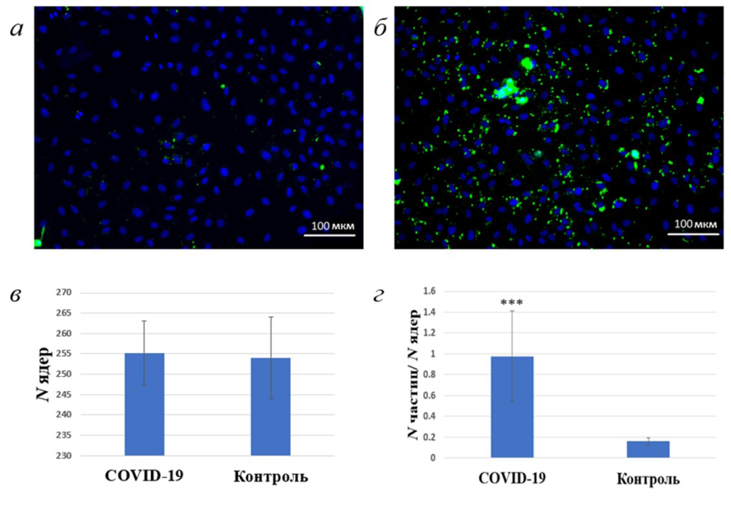 Рис. 1. Связывание С3/С3b клетками HUVEC под воздействием плазмы крови здоровых доноров и больных COVID-19. а – Окрашивание клеток антителами к С3/С3b и ядерным красителем Hoechst 33258 после инкубации с плазмой крови здоровых доноров; б – окрашивание клеток антителами к С3/С3b и ядерным красителем Hoechst 33258 после инкубации с плазмой крови больных COVID-1; в – количество ядер в поле зрения после инкубации клеток с плазмой крови здоровых доноров и больных COVID-19 (p ≥ 0.8); г – среднее количество С3/ С3b-иммунопозитивных частиц на ядро в культуре клеток HUVEC после инкубации с плазмой крови здоровых доноров и больных COVID-19 (***p < 0.001).