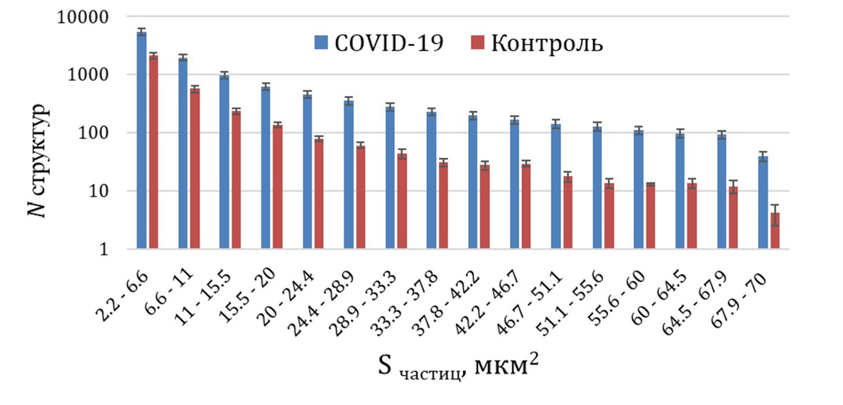 Рис. 2. Распределение C3/C3b-иммунопозитивных структур по количеству и площади в культуре клеток HUVEC после инкубации с плазмой здоровых доноров и больных COVID-19. N – среднее число иммунопозитивных структур заданного диапазона размеров в сканируемом поле зрения, полученное с 12 независимых случайных кадров (p ≤ 0.001).