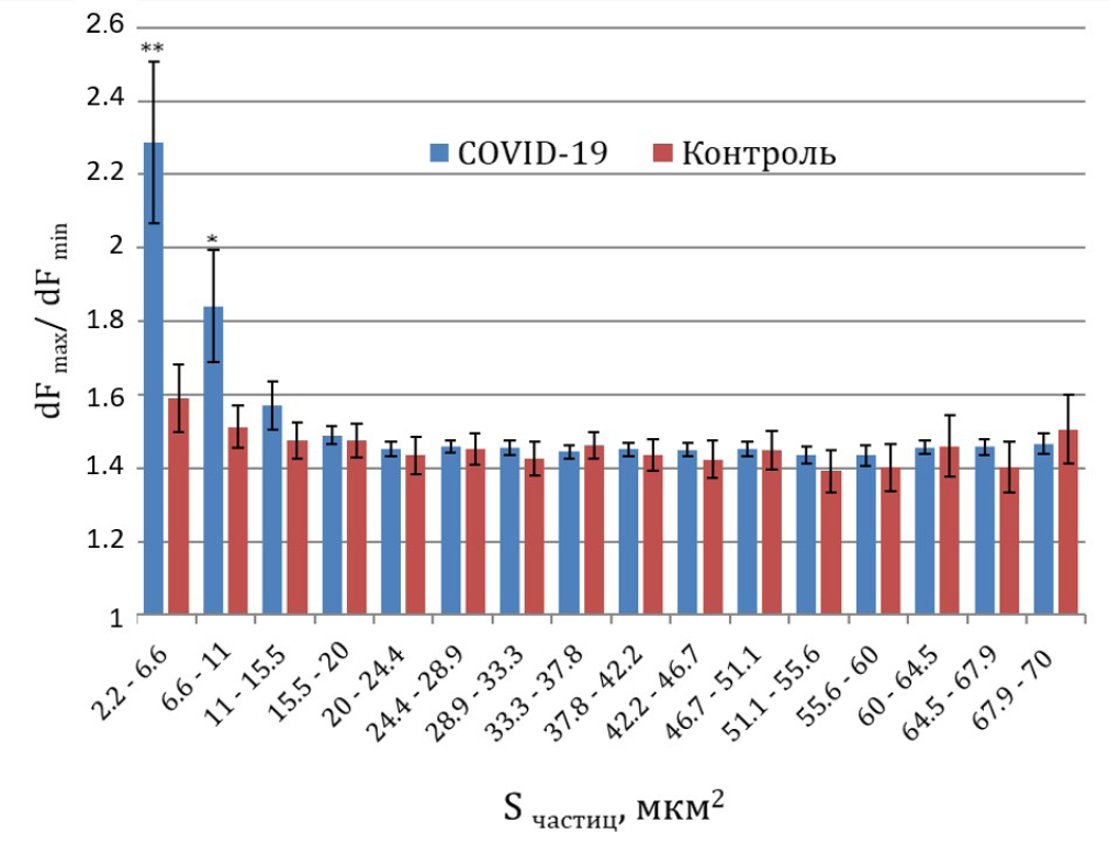 Достоверность различий формы С3/С3b-иммунопозитивных структур (dFmax/dFmin) среди частиц одного размера (мкм2) между контролем и опытом (рис. 3) оценивали согласно t-критерию Стьюдента для независимых выборок.