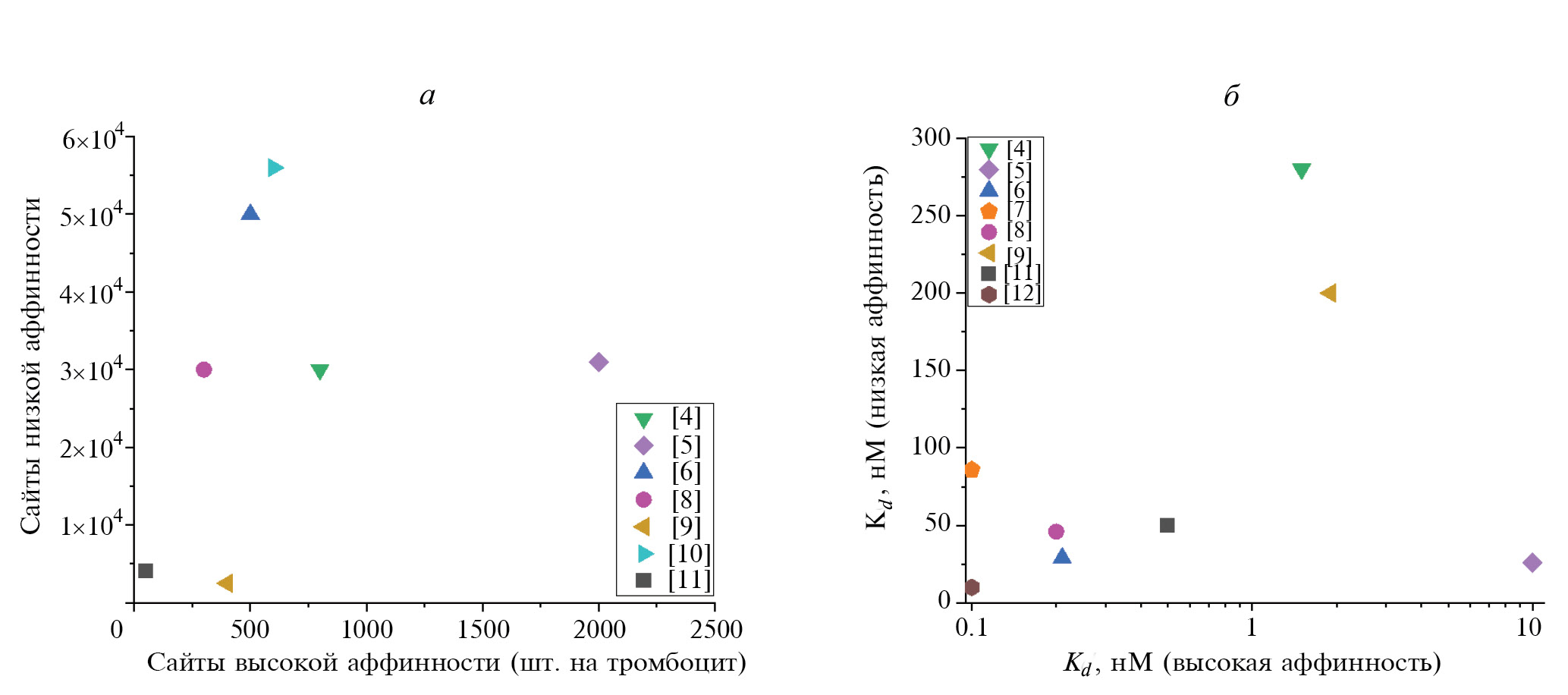 Рис. 1. Графическое представление количества сайтов связывания тромбина и их аффинности в выборке различных экспериментальных работ. а – Среднее количество сайтов связывания тромбина на поверхности тромбоцита. По оси X отложено количество сайтов высокой аффинности, по оси Y – низкой аффинности. б – Средняя константа диссоциации для сайтов высокой и низкой аффинности. По оси XKd сайтов высокой аффинности (логарифмический масштаб), по оси Y – низкой аффинности. Каждая точка – данные из определенной статьи, представленной в обзоре. Цвет и форма символа соответствуют номеру статьи в списке литературы.
