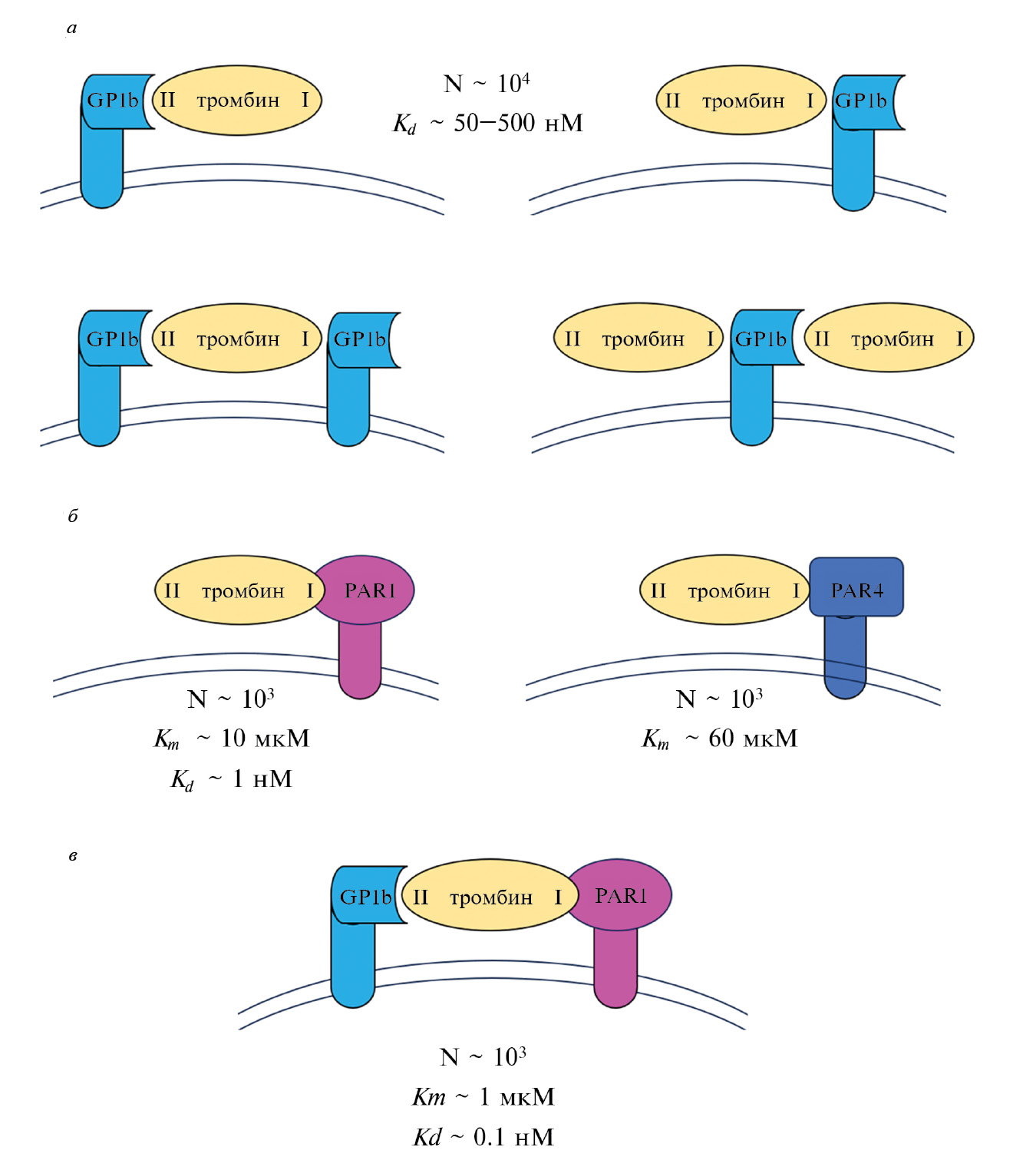 Как видно из рис. 1, в большинстве работ оценки количества сайтов низкой аффинности имели значения более 20 000, что, в целом, соответствует измеренному количеству молекул GPIbα на поверхности тромбоцита. Также имеется неплохое согласие между соответствующими диапазонами Kd, описанными для GPIbα (50–500 нМ) и описанными параметрами для низкоаффинных сайтов (10–300 нМ, рис. 1). Таким образом, образование комплекса тромбина с GPIbα, по всей видимости, соответствует связыванию с сайтами, характеризуемыми низкой аффинностью (рис. 2а). Связывание тромбина с сайтами высокой аффинности, в свою очередь, соответствует взаимодействию тромбина с PAR-рецепторами, а также одновременному взаимодействию тромбина с GPIbα и РAR-рецептором (рис. 2б, 2в). Таким образом, образование более стабильных комплексов тромбина одновременно с GPIbα и РAR, которое может соответствовать взаимодействию с сайтами высокой аффинности, может происходить в два этапа: связывание с GPIbα и последующее взаимодействие с PAR-рецепторами, запускающее их протеолитическую активацию. В пользу такой картины свидетельствуют данные о существенном уменьшении скорости активации PAR1 рецепторов при ингибировании связывания тромбина с GPIbα [45].
