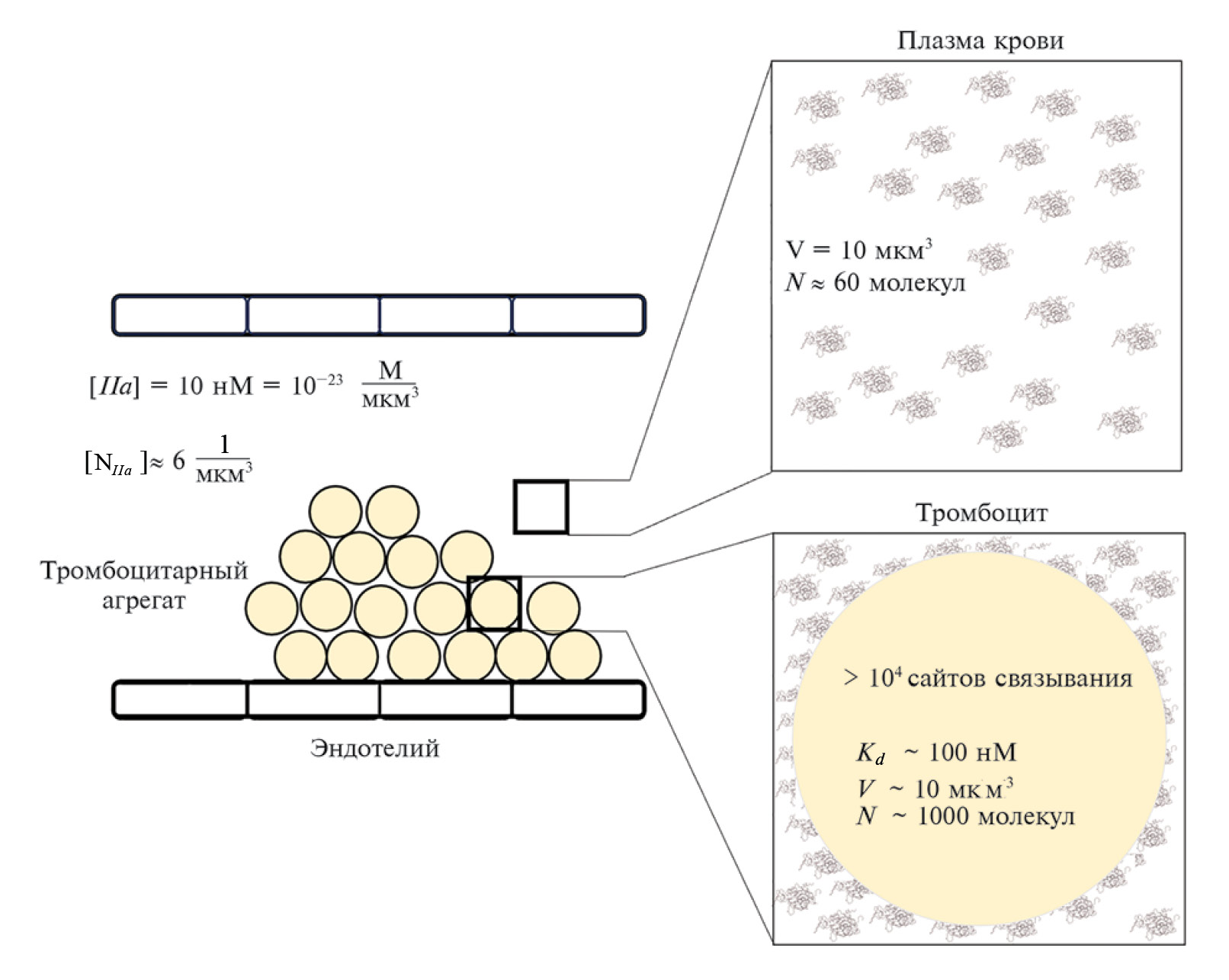 Для того чтобы оценить потенциальные эффекты такого связывания, можно рассмотреть ситуацию в равновесии, когда локальная концентрация свободного тромбина соответствует 10 нМ. В таком случае в 10 фл (10 мкм³) плазмы будет содержаться в среднем 60 молекул тромбина (рис. 3).