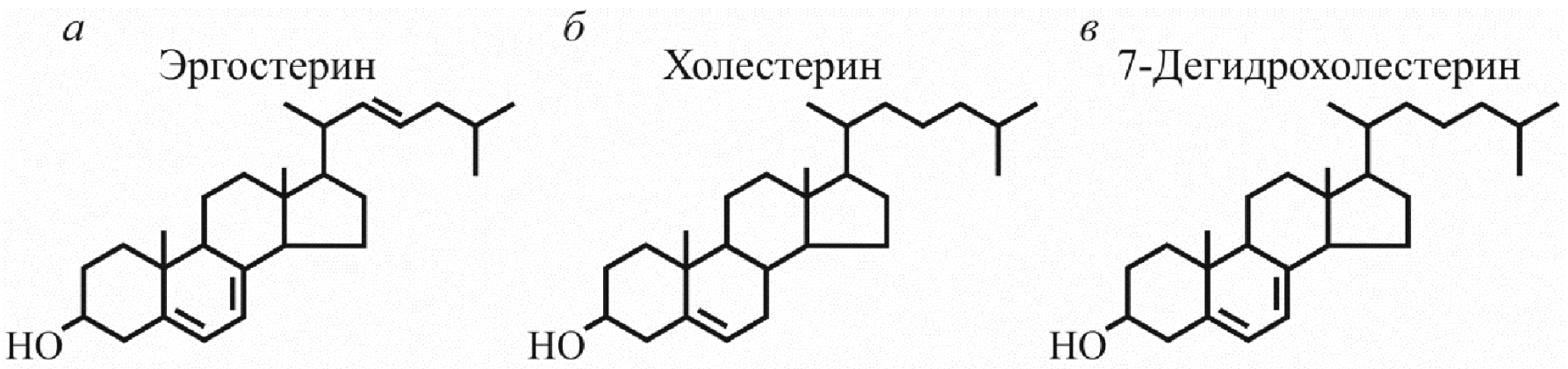 Рис. 1. Химические структуры стеринов: а – эргостерин; б – холестерин; в – 7-дегидрохолестерин.
