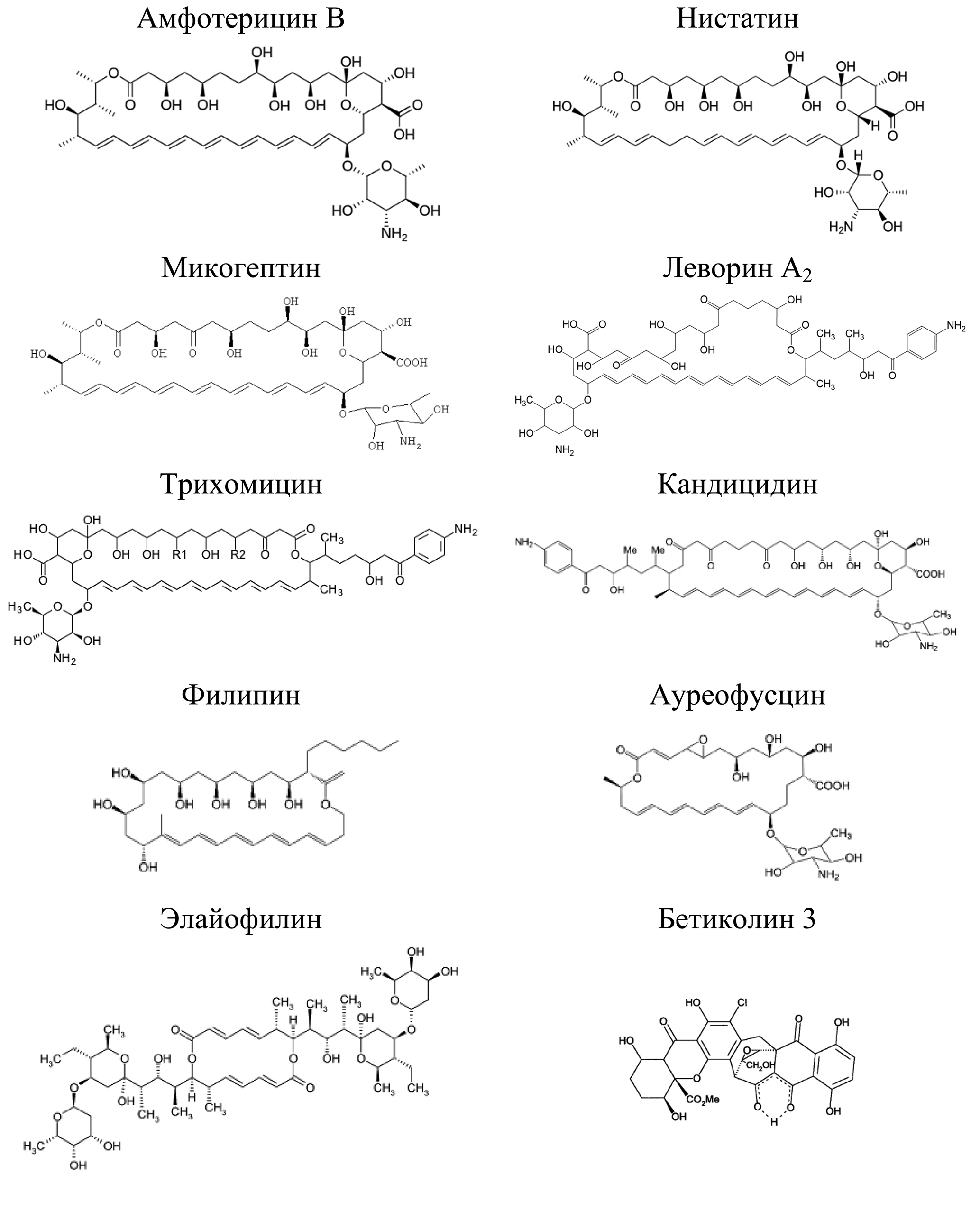 Рис. 5. Химическая структура порообразующих антимикробных агентов непептидной природы: амфотерицина В, нистатина, микогептина, леворина А2, трихомицина, кандицидина, филипина, ауреофусцина, элайофилина и бетиколина 3.