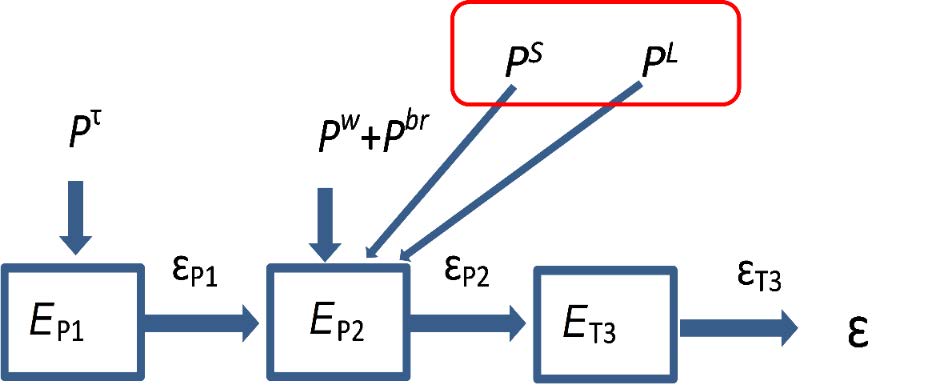 Энергетический спектр в многомасштабной модели разделен на диапазоны, в которых турбулентность генерируется разными механизмами: сдвигом скорости течения (Pτ), поверхностными волнами (Pw) и их обрушениями (Pbr). Дополнительно во второй диапазон вводятся механизмы генерации стоксовым дрейфом (PS) и ЦЛ (PL). В третьем диапазоне (инерционном) турбулентность не генерируется, а переносится по спектру от малых к большим волновым числам. В каждом из этих диапазонов циркулирует соответствующее количество энергии (E). Схематично расчет в этой модели генерации, передачи энергии по спектру и диссипации (ε) представлен на рис. 3.