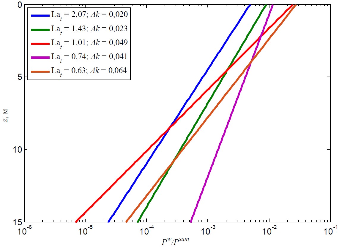 Результаты расчетов с реальными гидрометеорологическими условиями отношения скорости генерации волновыми движениями к общей скорости генерации турбулентной энергии Pw/Psum с учетом зависимости (1) при разных числах Ленгмюра представлены на рис. 5. То есть рост вертикальной скорости переноса волновой кинетической энергии приводит к увеличению влияния волнения на общую генерацию турбулентности. В определенном смысле уменьшение числа Ленгмюра характеризует увеличение крутизны поверхностных волн Ak, т. е. усиление нелинейных эффектов в волновых движениях, что приводит к росту общей турбулизации слоя.