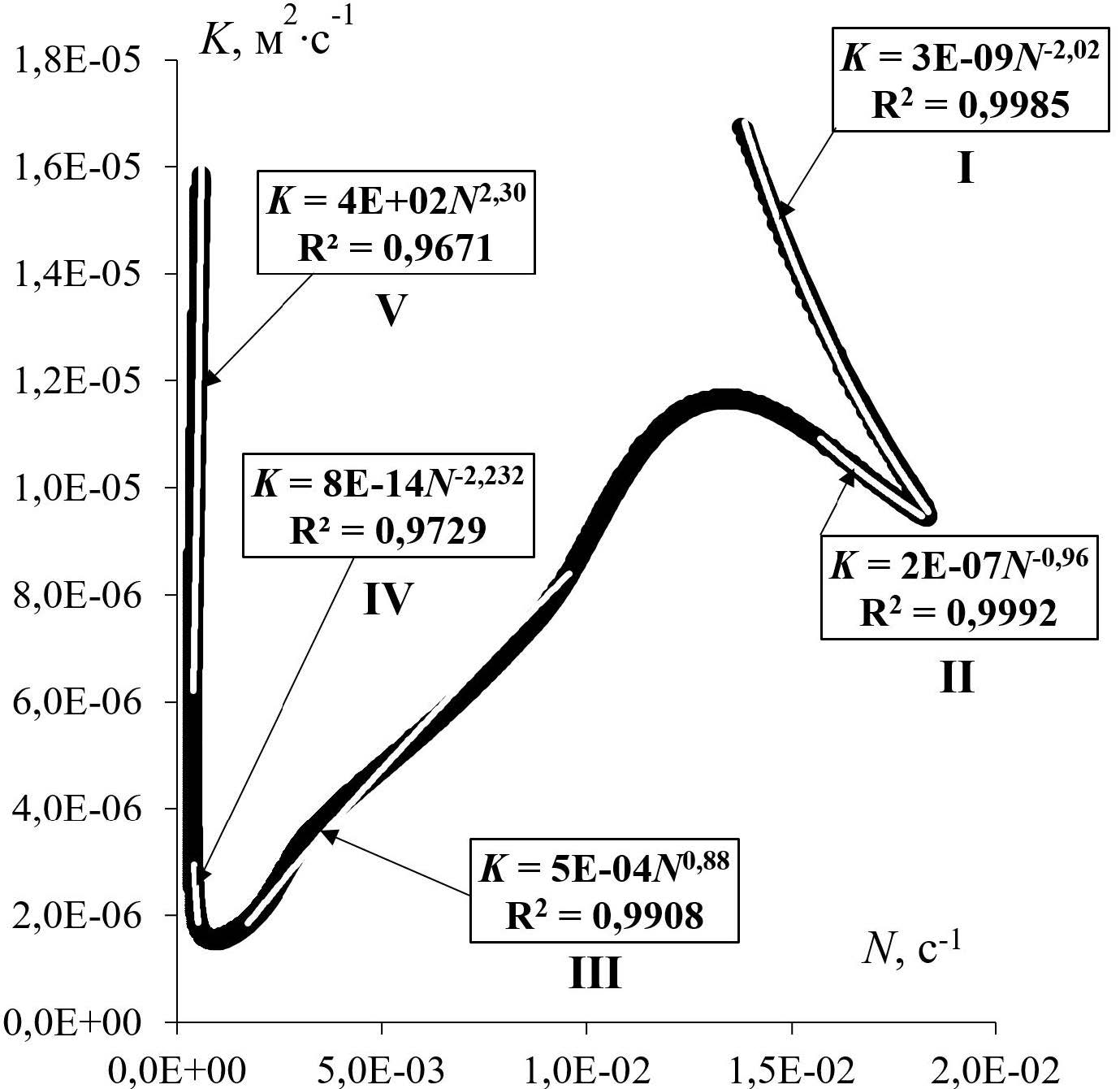 На основе большого количества экспериментальных данных и модельных наработок в предыдущих исследованиях был получен ряд важных результатов, характеризующих особенности вертикального турбулентного обмена в стратифицированных слоях Черного моря, позволивший установить степенную зависимость коэффициента диффузии тепла и солей от частоты плавучести N для глубоководной части исследуемого бассейна. Показатели этой степенной функции определяются характером внутренних волн в конкретной среде, но также зависят от особенностей топографии дна [38]. Сама модельная зависимость K(N) (черная линия) с аппроксимациями (белые линии) для выделенных слоев представлена на рис. 9.