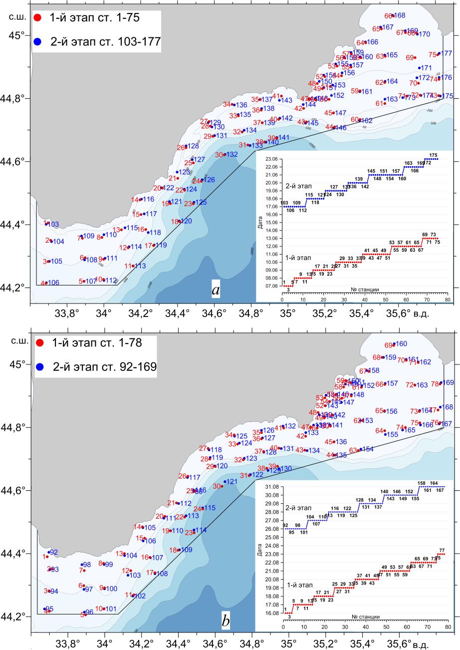 Рис. 1. Положение станций, выполненных в ходе 122-го (a) и 123-го (b) рейсов НИС «Профессор Водяницкий». На врезках – сроки и номера зондирований