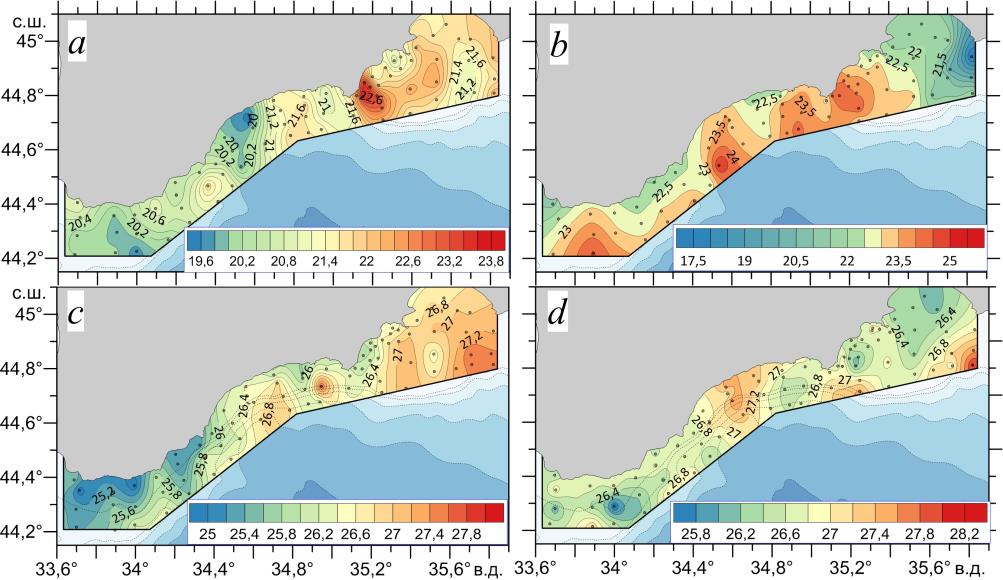 Гидрологические измерения летом 2022 г. проводились в 122-м (июнь) и 123-м (август) рейсах НИС «Профессор Водяницкий» и, в отличие от пред-шествующих лет, исключительно в пределах территориальных вод России (рис. 1). Уменьшение площади съемок при сохранении общего экспедиционного времени (25 сут) позволило увеличить количество гидрологических станций и получить детальные пространственные распределения гидрологических параметров, отражающие текущее состояние структуры вод в прибрежной зоне Крыма. Резерв экспедиционного времени в обоих рейсах позволил выполнить повторные гидрологические съемки. Положение станций показано на рис. 1, a, b.